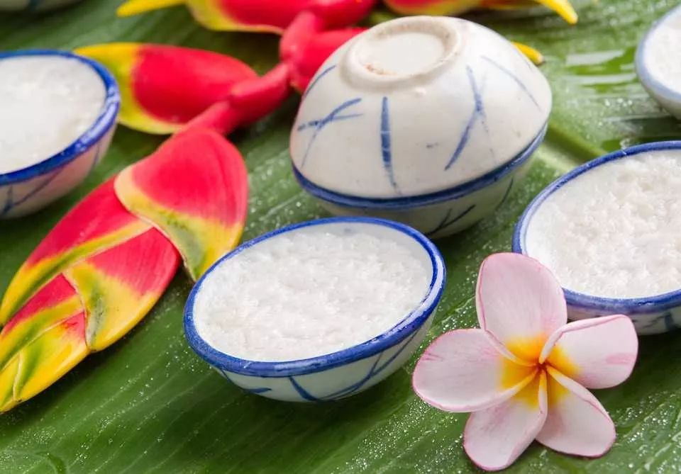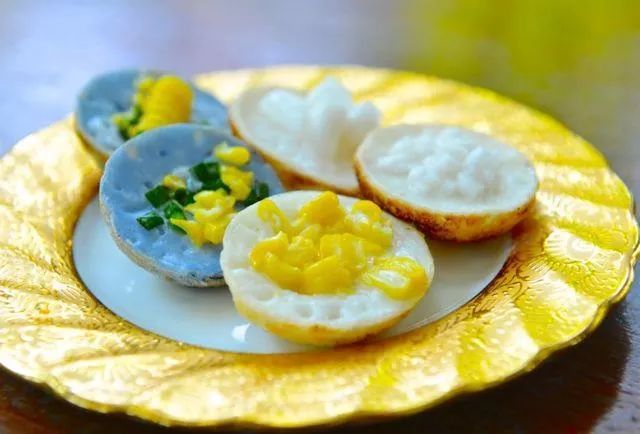 泰国的面摊常能见到桌上就摆着几樽小瓷碟相互倒盖着,拿起来飘来尽是一股浓郁的椰奶香,碟子里乳白的糕状点心就是「泰式小碗粿」。这是泰国一种古老的传统点心,使用粘米粉、蒟蒻薯和绿豆粉和椰浆搅拌均匀,倒入已加入浓缩香兰汁的小碟子中,再将它蒸熟就完成这道简单又好吃的桌边美食。软绵的椰粿,入口即化,和着最底下也被蒸成糕状的香兰一起放入嘴里,更是会让人一口接着一口,停不下来。