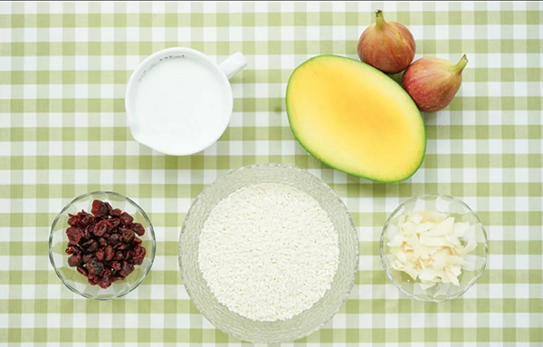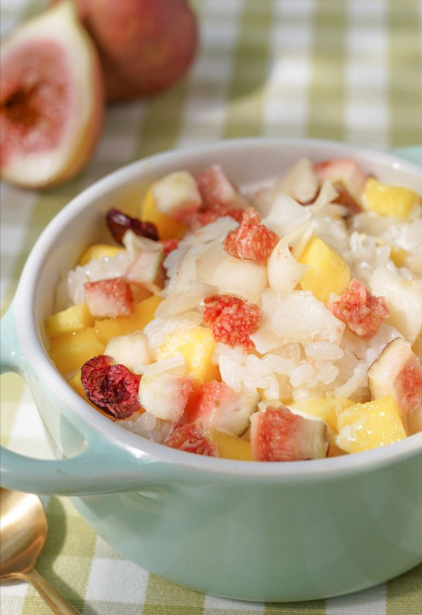 4. 芒果跟无花果切丁,铺在糯米饭上,最后撒上蔓越莓干、黄桃干、菠萝干、芒果,sg飞艇香脆椰子片(按个人口味调),开吃吧!