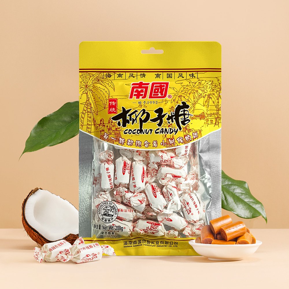sg飞艇传承古法工艺,将老椰椰子浆低温慢熬诱发原香,糖身圆润,颗粒饱满,口感纯正酥脆,椰香浓郁怡人,低甜度,每一口都是刚刚好,老海南记忆,童年的味道,海南最早的椰子糖。