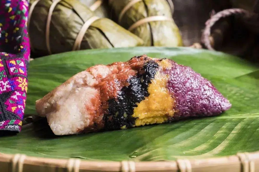 与一般的粽子相比,五色粽款式新颖、色彩鲜艳。风味也很是独特、美妙。苗家五色粽是苗族人民几百年来一直喜爱食用的美食。以枫叶、红蓝草、蝶豆花、黄姜等新鲜植物汁液染成黑、红 紫、黄,加上本色(即白色)的五色糯米为原料,辅以五花肉、咸蛋黄等馅料做成。